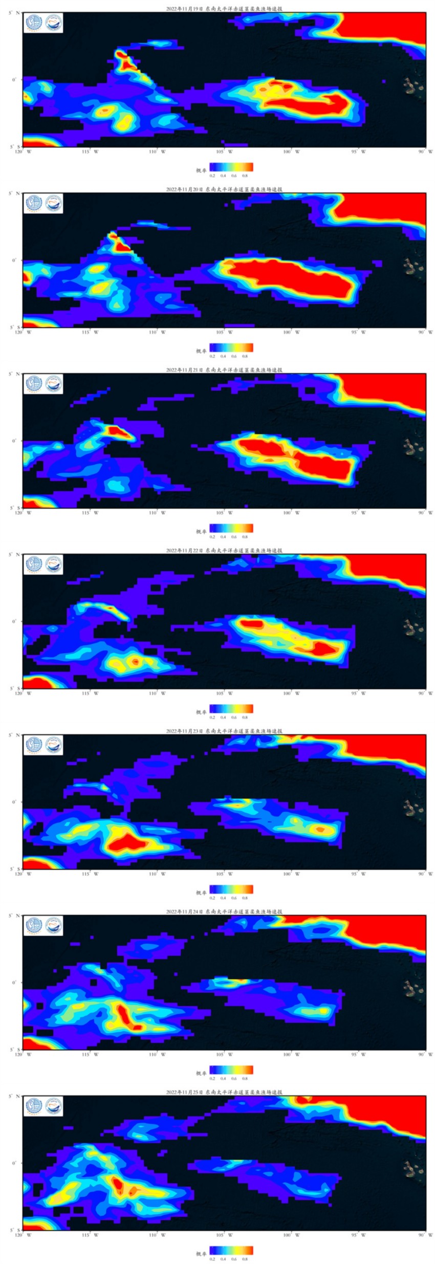 目前适宜渔场广泛分布在东南太平洋赤道,高密度渔场受SST影响斜向分布于赤道,未来一周高密度区域不稳定,变化明显,请生产企业注意。以上结果供企业参考。